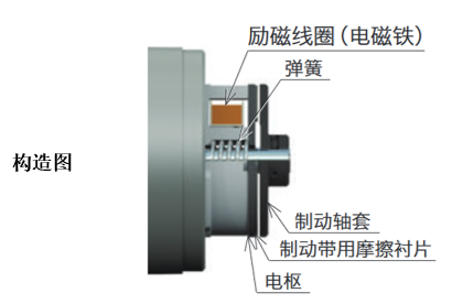 在未施加電壓的狀態下電樞會釋放,制動帶用摩擦襯片受螺旋彈簧擠壓至制動軸套,電動機軸被固定。