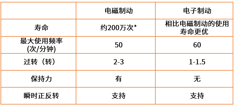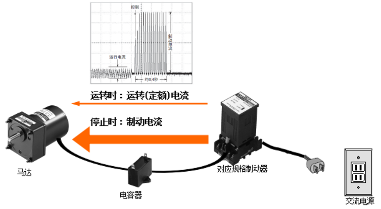 由于制動力極大,電動機單體時約于0.1秒間瞬時停止,過轉量亦變為1∼1.5轉以下。制動電流約于0.4秒間流經電動機后會自動切斷電流。(不具備保持力。)