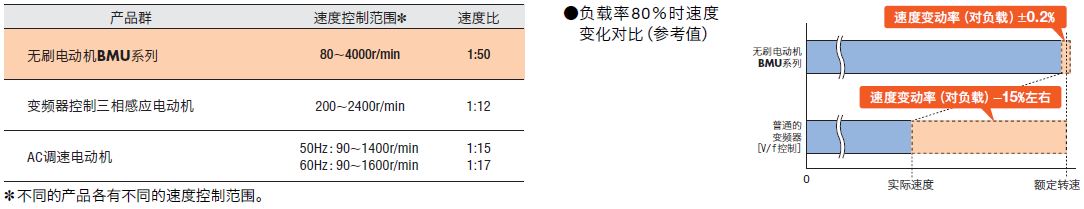 無刷電動機的速度控制范圍比AC調速電動機及變頻器更廣。適用于從低速到高速需保持固定轉矩等的用途。