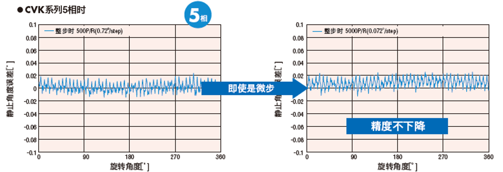 微步驅動時,靜止角度誤差即使變差,由于CVD驅動器采用新型驅動控制,使得搭配2相步進電動機時的精度誤差變化相對更小。