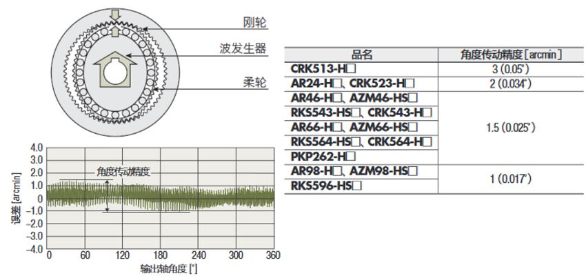 諧波減速機的減速比較高,因此,在輸出軸施加負(fù)載轉(zhuǎn)矩時的扭轉(zhuǎn),即使與電動機單體及其它減速電動機相比,不僅精度影響小,且具有高剛性。由于剛性較高,因此,即使負(fù)載變動大,也可以非常穩(wěn)定的定位。