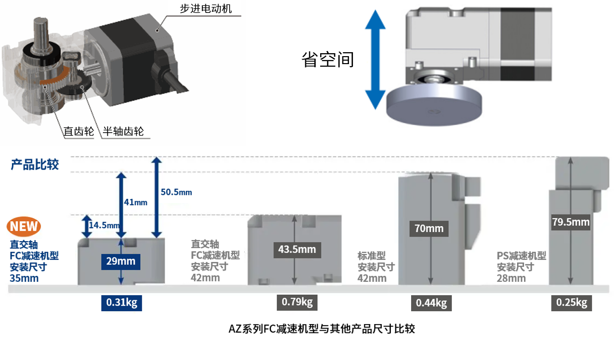 αSTEP AZ系列 FC減速機型是由半軸齒輪(圓盤狀的齒輪)與直齒輪構成的直交軸減速機。相對于負載軸,電動機可呈直角安裝,有助于省空間。
