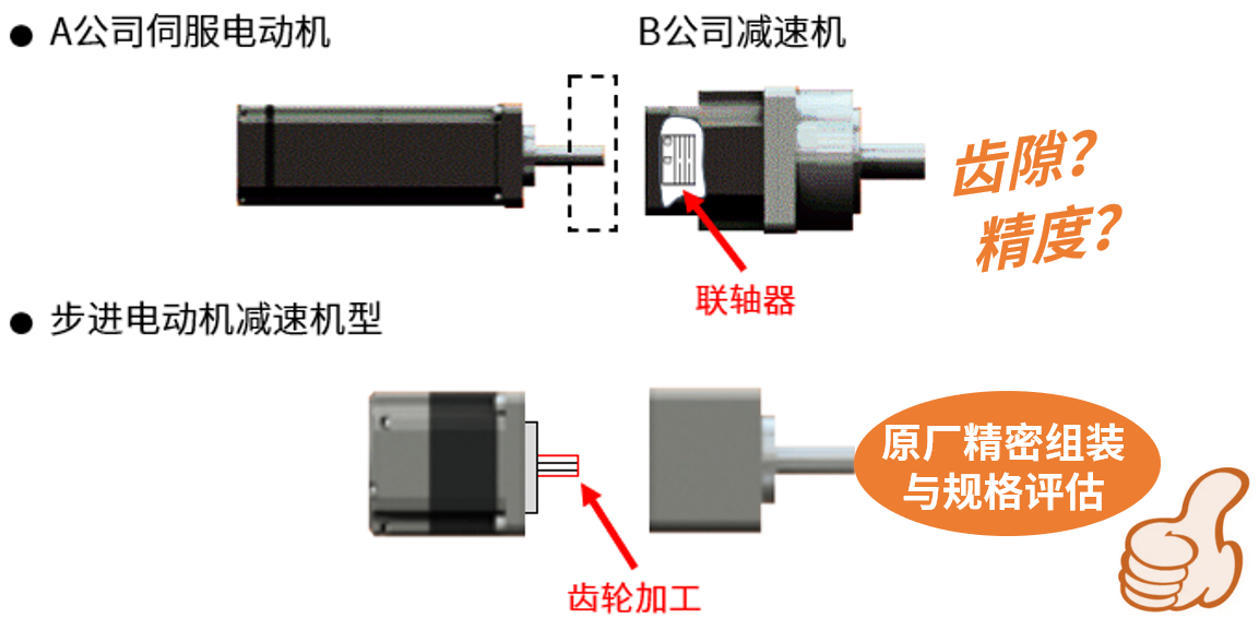 伺服電動機的減速機靠聯軸器聯結,步進電動機減速機型實現一體化、省空間,緊湊簡潔的設計且無需調整可輕易掌握「齒隙」及「精度」。