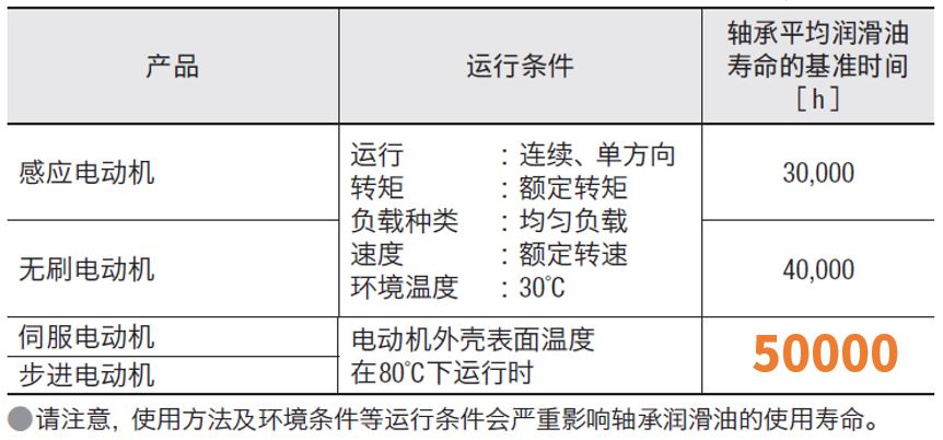 下表為各電動機的軸承平均潤滑油使用壽命的基準參考時間。