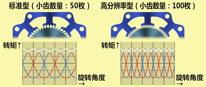 與標準型相比,齒輪更密,齒數(shù)更多。分散發(fā)生轉矩的偏差,減小靜止角度誤差。可避免晶圓針印、探針破損的可能,優(yōu)化檢測品質。