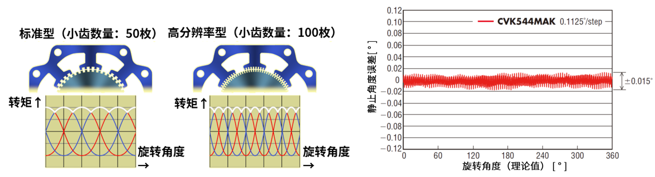 高分辨率型的齒輪更密,齒數(shù)更多。分散發(fā)生轉(zhuǎn)矩的偏差,減小靜止角度誤差與角度-轉(zhuǎn)矩特性。