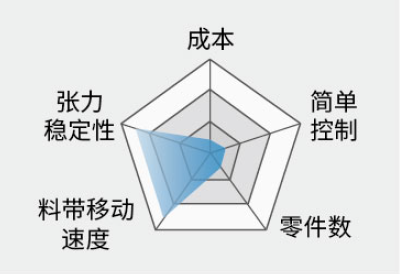 希望控制成本,但缺點明顯!![]() 卷取機構使用AC定速電動機時,料帶的 張力需要依靠重力錘維持。并且作為重 力錘正常工作的條件,送料軸的電動機 必須頻繁啟停,這導致了料帶張力不穩(wěn) 定和容易造成斷裂的問題。而且料帶移 動速度難以提商。另外,卷料軸受到料盤 直徑變化的影響,料帶的速度無法恒定。 ![]()