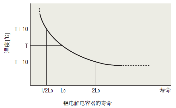 此外,一般對鋁電解電容器依據“Arrhenius法則”具有如下圖所示的特性,溫度比某個基準溫度T高10°C時,壽命為基準溫度T的1/2,相反地,比基準溫度T低10°C時,壽命為基準溫度T的2倍。