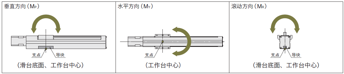 在用電動滑臺搬運工作物時,以工作臺中心(支點)為原點,若工作物的重心位置偏置,負載慣性力矩會對直線導軌發生作用。根據偏置位置,作用方向分別向垂直方向(MP)、水平方向(MY)和滾動方向(MR)作用。