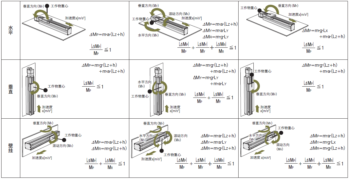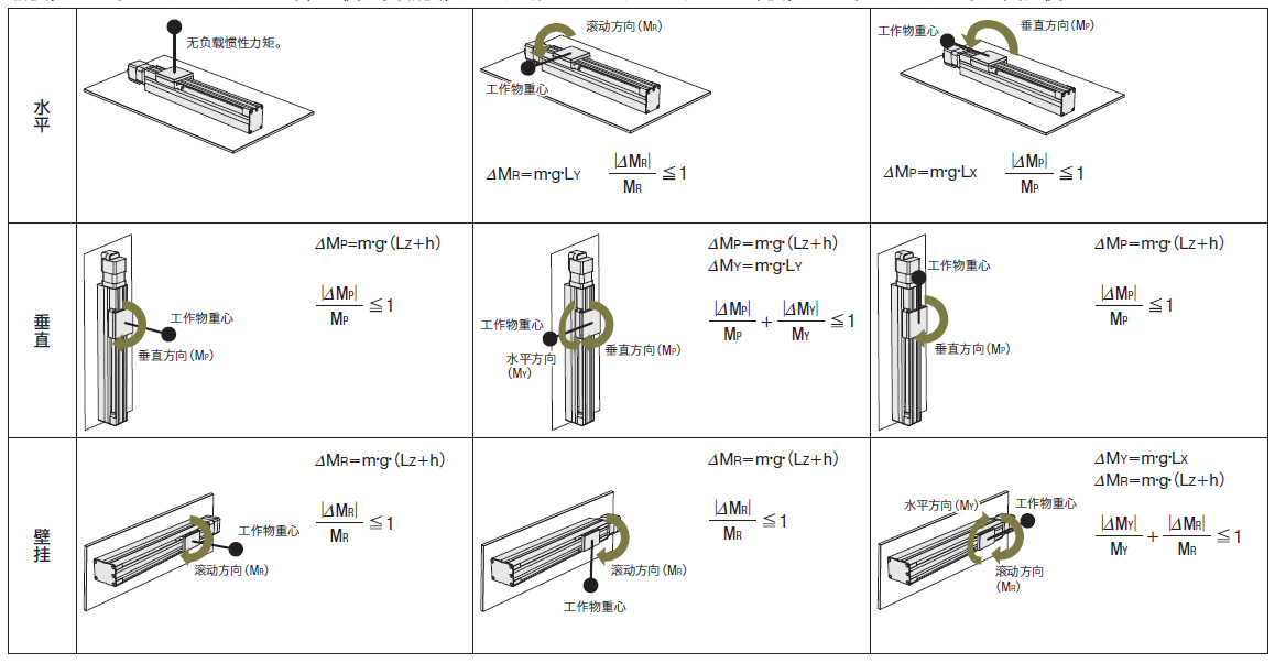 ◇ 靜態慣性力矩作用的考慮點以下圖解為電動滑臺的設置條件和負載伸出狀態的代表性組合范例。從此圖解中選擇符合用戶使用狀態的產品。求出電動滑臺停止狀態下的負 載慣性力矩(⊿MP、⊿MY、⊿MR),并使用負載慣性力矩判斷公式確認是否在靜態容許慣性力矩(MP、MY、MR)范圍內使用。