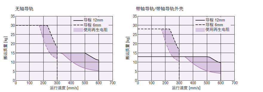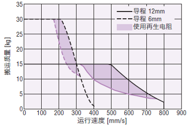 在垂直方向運行EACM6型的電動缸時,因驅動條件的不同,可能會檢測出過壓保護的警報。此時請參考下列運行速度―搬運質量特性圖,將本公司的再生電阻