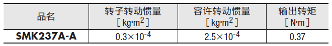 代入轉子轉動慣量求出必要轉矩為TM=0.362[N·m],即可得知小于輸出轉矩的值。之后,確認容許轉動慣量。(4)中求得的轉動慣量在容許轉動慣量以下,因此可使用SMK237A-A。