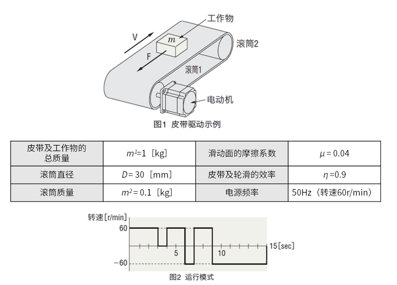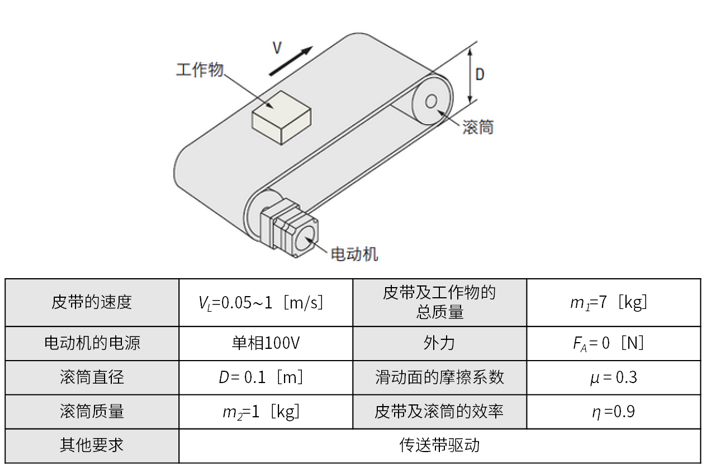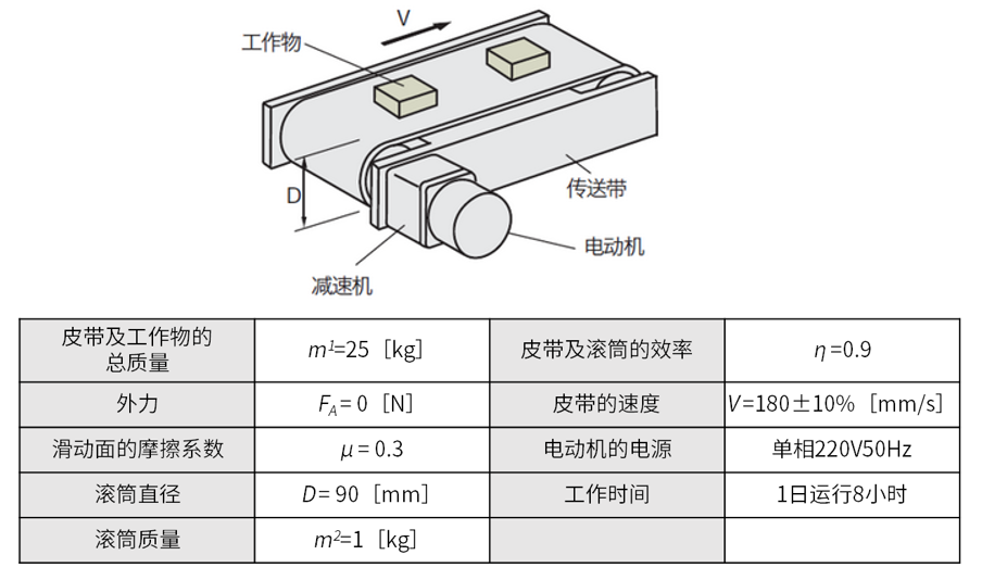 此為在傳送帶驅動上使用感應電動機時的選用例。須按下述要求規格來選用電動機。