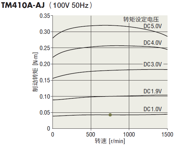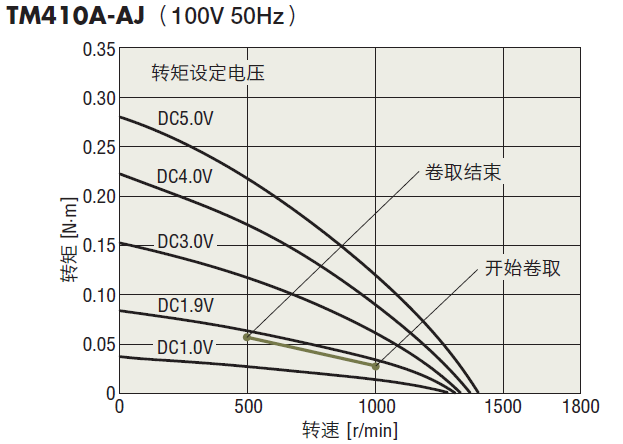 從力矩電動機組合產品TM系列中選擇滿足以上必要條件的電動機。TM410A-AJ的轉速―轉矩特性圖為例,對照一下必要條件,則可發現與轉矩設定電壓設定為DC1.9V時的特性大致相同。